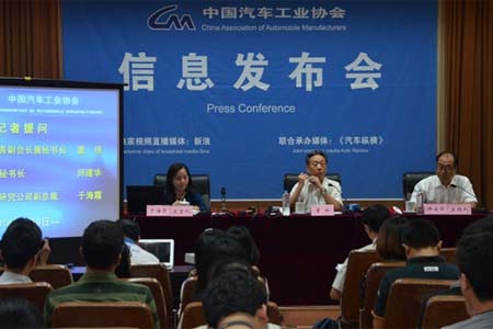 中國(guó)汽車(chē)工業(yè)協(xié)會(huì)舉行發(fā)布會(huì),協(xié)會(huì)秘書(shū)長(zhǎng)董揚(yáng)(中)認(rèn)為新能源汽車(chē)將繼續(xù)快速增長(zhǎng)。