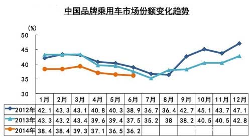 整個(gè)上半年,中國(guó)品牌乘用車(chē)市場(chǎng)份額一直在萎縮。共銷(xiāo)售363.03萬(wàn)輛,同比盡管增長(zhǎng)了1.78%,但大大落后與整體乘用車(chē)市場(chǎng)11.18%的漲幅。中國(guó)品牌乘用車(chē)市場(chǎng)占有率因此下降3.48個(gè)百分點(diǎn)。