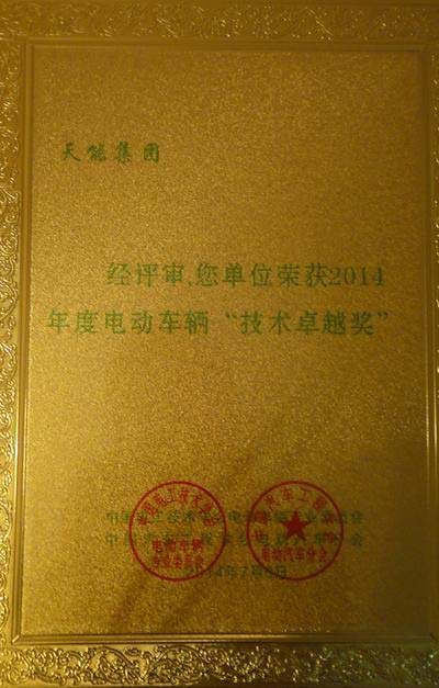 天能集團憑借電池的優越性能喜獲“2014年度電動車輛技術卓越獎”