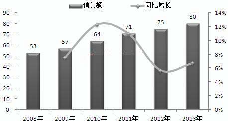 圖表:2008-2013年UPS銷售額走勢圖(單位:億元,%)