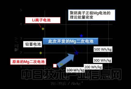 圖:已實用化的二次電池與此次開發的Mg二次電池的容量、密度和電壓的關系。越靠右上,能量密度越高。