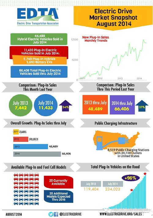據美國華盛頓的電動交通協會近日公布的在美電動車市場銷售數據顯示,七月份上路行駛的插電式電動車總量同比去年增長了96%。插電式電動汽車從2010年末到2013年7月共計銷售119,404輛。從那時起到2014年7月,共售出114,619輛插電式電動車,使銷售總量達到了234,023。