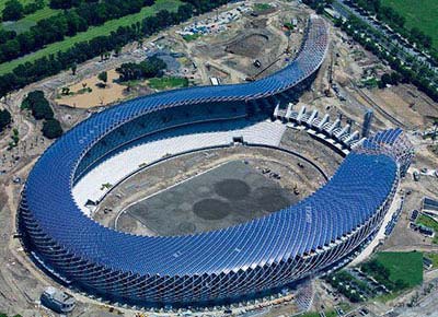 2、太陽(yáng)能體育場(chǎng)龍騰體育館是目前臺(tái)灣最大的體育場(chǎng),也是世界上第一座完全由太陽(yáng)能供電的運(yùn)動(dòng)場(chǎng)館。該體育館以龍為主題,場(chǎng)館屋頂上的8844塊太陽(yáng)能電池板構(gòu)成了巨龍身上的鱗片。龍騰體育館總裝機(jī)容量為1兆瓦。