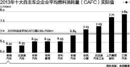 根據工信部2013年3月發布的《乘用車企業平均燃料消耗量核算辦法》,企業當年乘用車燃料消耗量實際值與目標值達到100%,即可獲得優于目標值額度,反之將獲得劣于目標值額度。上述報告稱,將有22家未達標企業獲得劣于目標值額度,后三位企業分別為北汽銀翔、北汽股份和廣汽乘用車,均為自主企業。