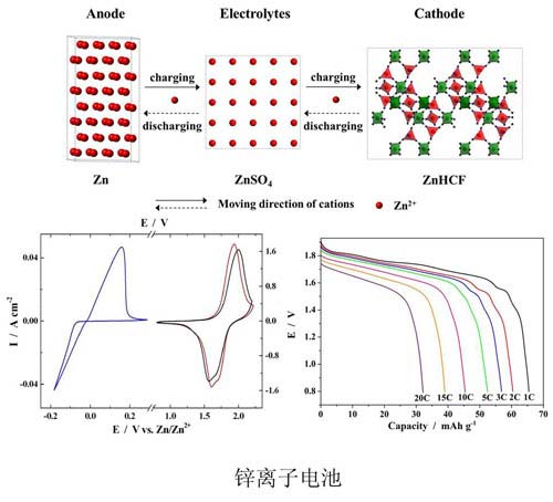 然而,低工作電壓是目前制約新型水系離子電池發(fā)展的主要瓶頸之一。針對這一問題,中國科學(xué)院寧波材料技術(shù)與工程研究所動力鋰電池工程實驗室的科研人員在新型高電壓水系離子電池探索方面取得了系列進(jìn)展。該實驗室繼2013年首次提出鋰鈉混合離子電解質(zhì)理念來構(gòu)建新型水系離子電池,又?jǐn)U展式提出了鋰鉀和鈉鉀混合離子電解質(zhì)的新理念來構(gòu)建水系離子電池。新電池的工作電壓為1.45v,比能量達(dá)43whkg-1。在此基礎(chǔ)上,實驗室的科研人員還發(fā)現(xiàn)鋅鐵氰化絡(luò)合物可作為鋅離子電池正極材料,以金屬鋅為負(fù)極和鋅鐵氰化絡(luò)合物為正極構(gòu)建出一種新型高電壓水系鋅離子電池。其工作電壓達(dá)到1.7v,為目前報道的現(xiàn)有水系離子電池的最高值之一。
