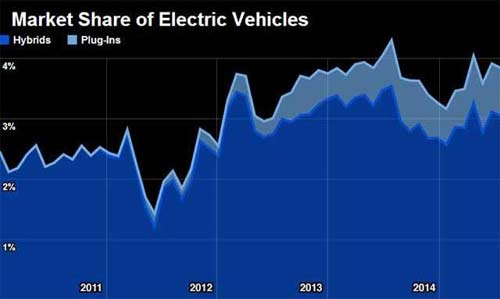 今年8月,電動車的銷售再一次較上月出現下滑。市場對電動車的興趣并未減弱,但是混合動力(HYbrid)和PLUG-IN(插電式)電動車合計僅占據汽車銷售市場4%的份額,表明消費者還沒有真正開始涌向電動車。在上述配圖中,深藍色代表混合型汽車,淺藍色代表插電式混合動力車。把它們合并在一起,也就是所謂的電動車的總稱。
