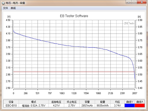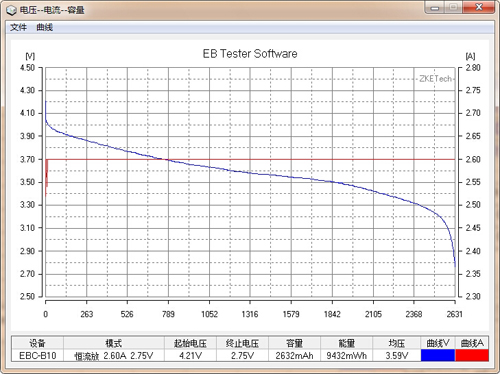 力神18650 2600mAh在室溫26度環境下經過5小時6分鐘34秒放電至2.7V終止電壓,得出實測容量是2657mAh,能量9935mWh,平均電壓3.74V。如圖中藍色放電曲線標注。
