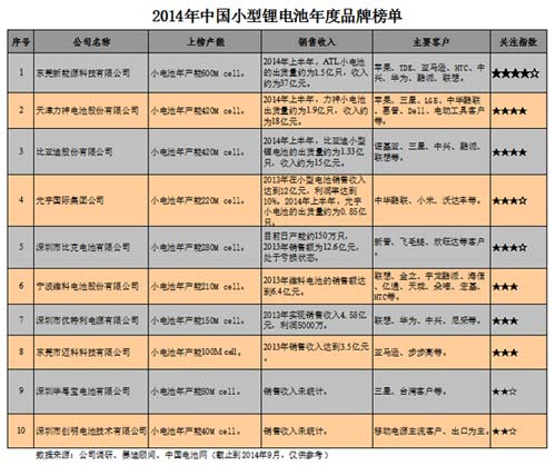 從2014年第二屆中國(成都)鋰電新能源產業國際高峰論壇(ABEC2014,鋰電“達沃斯”)組委會獲悉,28日中國電池網、賽迪顧問等機構聯合推出了2014年度中國小型鋰電池年度品牌榜單,該榜單根據我國小型鋰電池企業的產能數據、客戶分布、公司情況、誠信形象等得出,數據來源為公司調研和機構數據(數據統計截止到2014年9月,僅供參考)。上榜企業由賽迪顧問鋰電產業研究小組進行了專家點評。