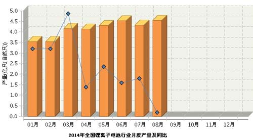 根據(jù)國家統(tǒng)計(jì)局公布數(shù)據(jù),全國鋰離子電池行業(yè)累計(jì)完成產(chǎn)量33.36億只(自然只),同比增長6.89%。其中:8月份完成產(chǎn)量4.54億只(自然只),同比增長-3.02%。2014年全國鋰離子電池行業(yè)月度產(chǎn)量及同比如下圖所示。