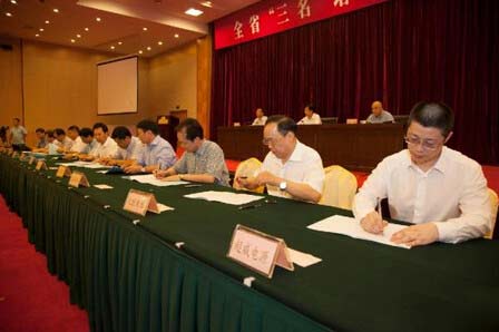 會上,周明明董事長上臺簽訂了第一批“三名”培育試點企業責任書,并作為首批試點企業代表作了表態發言。他以“推進品牌建設  爭創新能源國際化企業”為題,從實施科技創新,提升區域品牌價值、強化品牌建設,提升品牌美譽度、優化品牌管理,夯實品牌底蘊、加強國際合作,塑造國際品牌等四個方面,闡述超威將以品牌型龍頭企業為發展目標,加快四大創新,不斷整合公司產品、技術、管理、營銷等優勢,深化新能源行業電池技術研發,大力實施品牌戰略,向全球新能源行業龍頭企業的目標邁進。