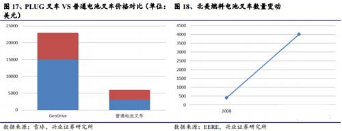 高效環保低成本的氫燃料電池叉車為運輸領域的核心應用。叉車是工業搬運車輛,是指對成件托盤貨物進行裝卸、堆垛和短距離運輸作業的各種輪式搬運車輛,是物料搬運設備的一種。目前,叉車是交通運輸領域中實現商業化較為活躍的主要品種。其主要生產商為Plug power公司。