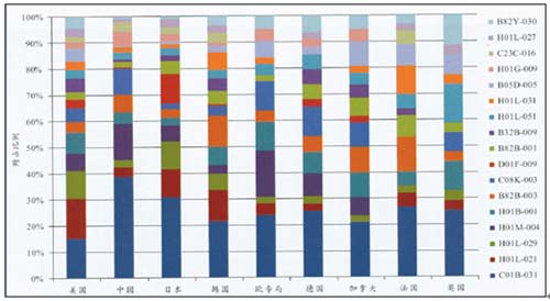 1、美國主要集中在C01B-031、H01L-021、H01L-029、H01B-001、H01M-004、C08K-003等領域。此外,B05D-005(表面涂布)方面的專利主要集中在美國。美國在其他各領域也有較多的專利申請。