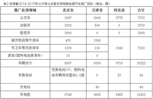 2014年至2015年,在京津冀地區(qū)公共交通服務(wù)領(lǐng)域共推廣20222輛新能源汽車。其中北京市8507輛,天津市6000輛,河北省5715輛,到2015年底,京津冀地區(qū)公交車中新能源汽車比例不低于16%,京、津出租車中新能源汽車比例不低于5%,河北省繼續(xù)做好示范城市新能源汽車的推廣應(yīng)用工作,新能源汽車在公交及公共服務(wù)領(lǐng)域的應(yīng)用水平國內(nèi)領(lǐng)先。
