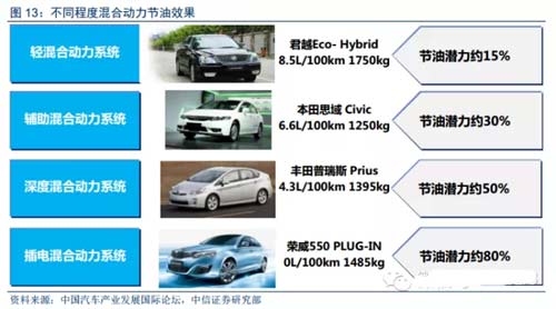 混合動力有望實現15%-50%的節油潛力。混合動力可劃分為輕混合動力系統、輔助混合動力系統(中混)、深度混合動力系統,分別有望實現15%、30%、50%的節油潛力。如果采用插電式混合動力,則有望實現80%以上的節油潛力。