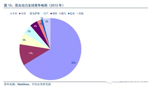 混合動力汽車全球年銷量規模約160萬輛,豐田、本田具有明顯競爭優勢。2013年全球混合動力汽車銷售160萬輛,分品牌看,豐田、本田、雷克薩斯三個品牌的市場份額分別為65%、11%、6%,具有明顯競爭優勢。