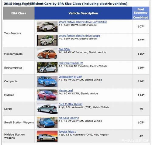 最近,EPA公布了2015年度能效最高的車型榜,毫無懸念,這個(gè)榜單基本上被電動(dòng)車所壟斷,一共8個(gè)級(jí)別9個(gè)冠軍車型中,6個(gè)是電動(dòng)車,另兩個(gè)是混合動(dòng)力車(詳見上圖)。