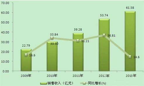 圖表1:2009-2013年我國薄膜電容器行業市場規模(單位:億元,%)
