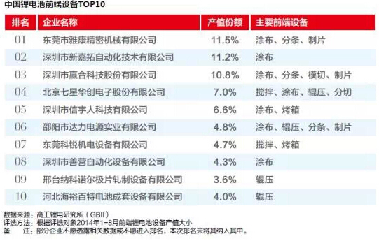 高工鋰電產(chǎn)業(yè)研究所(GBII)經(jīng)過詳細(xì)深入調(diào)研,評(píng)選出2014年中國(guó)鋰電池前端設(shè)備TOP10企業(yè),以期對(duì)讀者有所裨益。