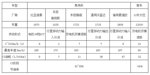 搜集了國內外主流乘用車和客車PHEV的技術參數,如表2所示,可以看出各主要廠商PHEV在CS模式的節油率均大于30%,PHEV客車節油率高達40%以上,即表明不充電狀態下節油率仍然較高。
