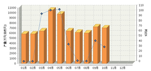 2014年1~10月,全國(guó)鉛酸蓄電池行業(yè)累計(jì)完成產(chǎn)量18,740.30萬(wàn)千伏安時(shí),同比增長(zhǎng)10.00%。其中:10月份完成產(chǎn)量1904.61萬(wàn)千伏安時(shí),同比增長(zhǎng)2.55%。