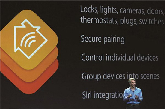 △ 蘋果智能家居。2014年6月,蘋果公司宣稱,最新設計的“HomeKit”智能家居平臺可實現(xiàn)通過智能手機遠程控制,同時,該平臺支持的產(chǎn)品線更為廣泛,例如:燈、門、溫度調(diào)節(jié)裝置、開關(guān)。