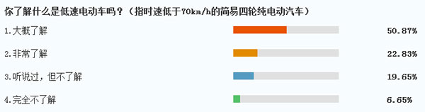 調(diào)查數(shù)據(jù)顯示,在參與網(wǎng)絡(luò)投票的人群中,有50.87%的網(wǎng)友表示對(duì)于低速電動(dòng)車“大概了解”,另有22.83%的網(wǎng)友選擇“非常了解”,占比超過(guò)70%,說(shuō)明低速電動(dòng)車這類產(chǎn)品在市場(chǎng)上的確擁有很高的關(guān)注度,選擇“完全不了解”這一選項(xiàng)的網(wǎng)友僅占全部調(diào)查人群的6.65%。