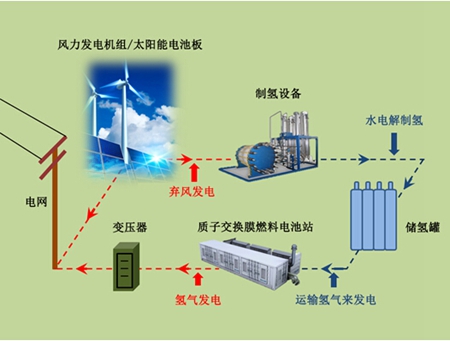 作為地球上最輕的元素,氫具有最高的能源密度,可以通過電將水分解產(chǎn)生。如果水電解槽與風(fēng)力發(fā)電或太陽能電池板集成,氫氣作為能量儲存的媒介可由多余的風(fēng)力、太陽能發(fā)電產(chǎn)生。在電網(wǎng)高峰時段,質(zhì)子交換膜(PEM)燃料電池站發(fā)電來滿足電網(wǎng)要求。由于PEM燃料電池發(fā)電過程不涉及氫氧燃燒,因而不受卡諾循環(huán)的限制,能量轉(zhuǎn)換率高;發(fā)電時不產(chǎn)生污染,發(fā)電單元模塊化,可靠性高,組裝和維修都很方便,工作時也沒有噪音。所以,質(zhì)子交換膜燃料電池電源是一種清潔、高效的綠色環(huán)保電源。