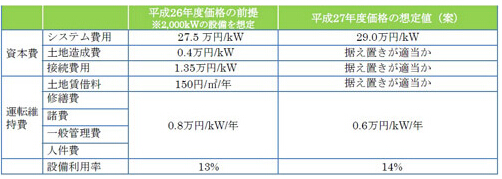 2014年度的采購價格前提和作為2015年度價格設想值的非住宅用光伏發電的成本數據
