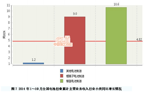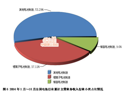 2014年1-10月,其他電池制造完成累計主營業務收入占53.29%,同比增長1.15%;鋰離子電池制造完成累計主營業務收入占37.11%,同比增長9.03%;鎳氫電池制造完成累計主營業務收入占9.6%,同比增長10.62%。(參見圖6、圖7)