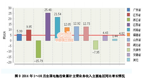 2014年1-10月全國電池行業主營業務收入同比增長較快的地區是江西、河南、山東、湖北、福建、江蘇地區。(參見圖9)