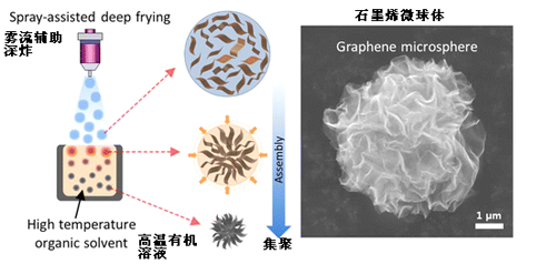 “這一簡單的霧流輔助式石墨烯分子自組裝工藝使用的是高溫有機溶劑,讓人想起油炸食品。” Pratchi Patel在美國《化學化工新聞》中具體描述了他們的成果,稱他們通過將氧化石墨烯噴入高溫溶劑制成了一種圓形類似于絨球的石墨烯微粒。他們的工藝有點像油炸。這一技術能夠“為制造電池和超級電容器上的電極材料提供一種簡單、通用的方法,并有可能提高蓄電設備的能效和功率密度。”