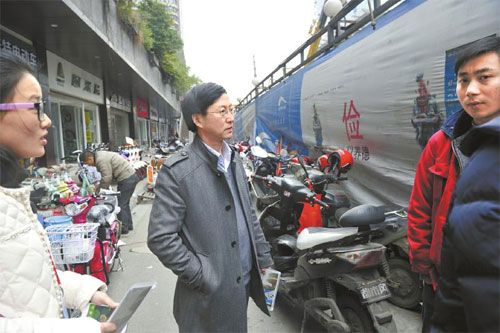 1月30日,成都西玉龍街,四川省人大代表、川大華西醫(yī)院教授甘華田(中)了解電瓶車電池回收情況。