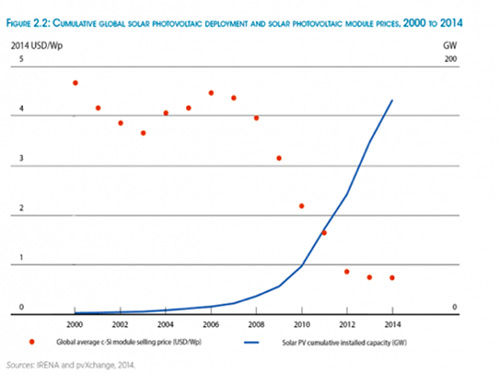 其中,太陽(yáng)能是發(fā)電成本下降幅度最大的可再生能源。自2009年以來(lái),太陽(yáng)能光伏組件成本下降75%,住宅太陽(yáng)能光伏系統(tǒng)發(fā)電成本較之2008年下降70%,從2010-2014年底,大型太陽(yáng)能光伏發(fā)電成本下降高達(dá)65%。