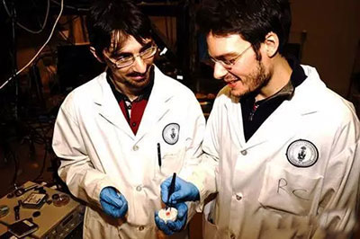 研究者ValerioAdinolfi(左)和RiccardoComin在測試鈣鈦礦晶體。在薄膜太陽能技術方面,該材料正吸引著大家的興趣,但其作為完美的單晶體還未被研究。(來源:密歇根大學工程學院)