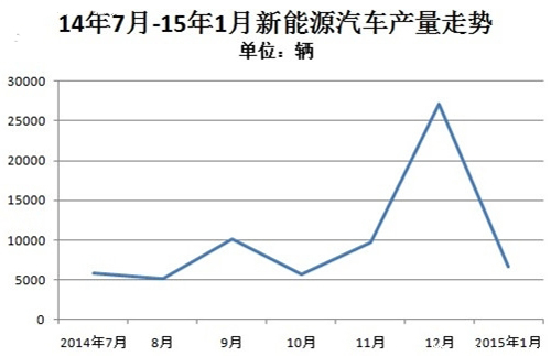 工信部2月4日發布了2015年1月份新能源汽車產量。根據機動車整車出廠合格證統計,2015年1月,我國新能源汽車生產6599輛,同比增長近5倍。 雖然環比2014年12月2.7萬輛的產量回落明顯,但這與前兩年中國新能源汽車年底沖高、年初回落的走勢基本一致,在補貼退坡的頭一個月產量還有如此增 長,也給2015年開了一個好頭。