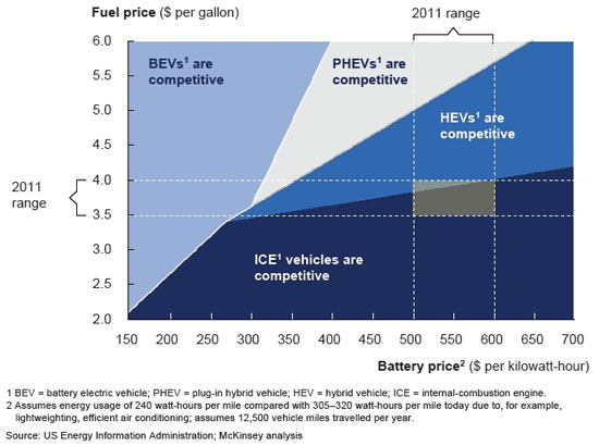 但這所謂的每千瓦時300美元,除了顯示電動車電池成本下降速度超乎預期外,是否還意味著電動車時代即將來臨呢?全球顧問公司麥肯錫(Mckinsey&Company)在2011年曾做了一張圖表,顯示不同的油價與電池價格情況下,純電動車、插電式混合電動車、油電混合車及一般汽車誰更具競爭力,灰色區(qū)塊的部分則是2011年的價格區(qū)間。從下圖圖表中可以看出,當電動車電池價格位于每千瓦時約300美元左右時,就是電動車競爭力逐漸起飛的時刻。