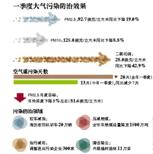 數(shù)據(jù)顯示,今年一季度,PM2.5累計(jì)濃度為92.7微克/立方米,同比下降19.0%;共發(fā)生空氣重污染13天,同比減少7天。