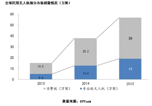 EVTank在研究報告中分析,軍用無人機需求與全球各個國家的軍費開支息息相關,目前全球軍費開支約占全球GDP的3%左右,歐洲經濟低迷,美國也打算縮減軍費開始,全球GDP增速下滑,預計未來全球軍費開支增速也將放緩,所以軍用無人機的增長速度不會太快。而民用無人機則將保持較快的增長速度,2014年全球民用無人機銷量37.8萬架,其中專業級無人機銷量約12.6萬架,消費級無人機銷量約25.5萬架,預計2015年同比將保持50%的增長。