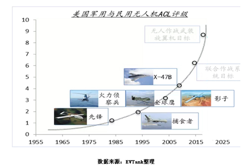 從無人機的定義及發展來看,EVTank認為國外更加注重飛行控制技術,美國空軍研究實驗室(AFRL)針對無人機自主控制能力,定義了美國未來將發展的無人機自主控制等級(Autonomous Control Level,ACL),共分為十個等級。
