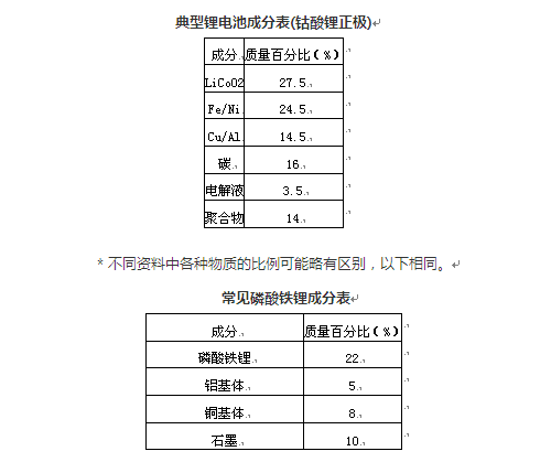 電池中有多種重金屬污染物,但是這些污染物大多都有經濟價值。目前常用的鋰離子電池正極材料有 LiCoO2,LiNiO2,LiMn2O4,LiFePO4和三元材料等,正極材料、乙炔黑導電劑與有機粘合劑涂覆于鋁箔上構成正極,負極主要是由片狀碳材料、無定形碳材料涂覆于銅箔上構成。電解質溶液中的電解質鹽一般為 LiCF3SO3,LiBF4和LiPF6等鋰鹽,常用的溶劑有碳酸乙烯脂(EC)、碳酸丙稀脂(PC)、碳酸二甲脂(DMC),甲基乙基碳酸酯(EMC)等。
