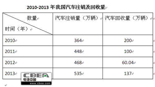 “回收難”是困擾我國報廢汽車產業的痛點。從我國汽車報廢量來看,我國已開始逐步進入汽車報廢的高峰期。2010—2013 年我國汽車注銷量分別約為 364 萬輛,448 萬輛,468 萬輛,535 萬輛,但2010—2013 年的回收量分別約為 200 多萬輛,100 多萬輛,60.04 萬輛,137 萬輛(見下表)。
