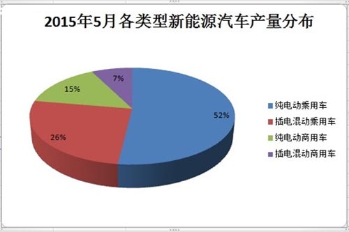 2015年1-5月,新能源汽車累計生產5.36萬輛,同比增長近3倍。其中,純電動乘用車生產2.58萬輛,同比增長近3倍,插電式混合動力乘用車生產1.37萬輛,同比增長3倍;純電動商用車生產9248輛,同比增長近6倍,插電式混合動力商用車生產4761輛,同比增長58%。