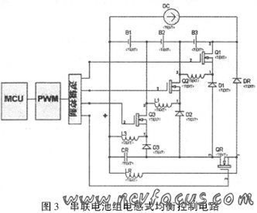 系統(tǒng)中,及時檢測電池組中各電池的狀態(tài)信息,送入MCU中,通過算法處理,控制PWM的輸出,驅動開關器件的導通和關斷。當某個電池電壓較高時,相應的開關器件導通,電池將能量儲存到相應的電感中,當開關斷開后,能量轉移到下游的電池,多余能量轉移到公共電容上并回饋給充電電路。