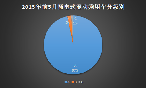 3、2015年前5月純電動乘用車、插電式混動乘用車分級別銷量及占比(單位:臺)