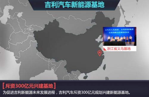 吉利新能源新基地坐落于浙江省義烏市。吉利控股集團有限公司與義烏市人民政府于本月16日下午舉行全面戰略合作暨新能源生產基地、動力總成研發中心項目簽約儀式。雙方將在義烏建成一座集汽車核心零部件制造,新能源研發制造及整車生產為一體的“吉利綠色動力小鎮”。