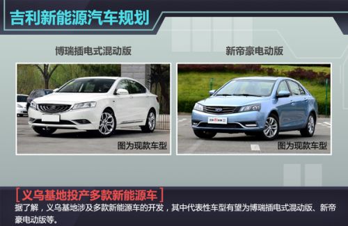 據了解,義烏基地將有望投產博瑞插電式混動版、新帝豪電動版等車型。在此之前,吉利汽車發布新能源戰略規劃,企業將更專注于研發具有市場競爭力的高性能、高科技含量的新能源車型。企業將重點進行純電動和插電式兩個平臺開發,基于平臺開發實現不同車型的搭載應用。企業力爭自2015年起每年有1-2款新能源車型上市,進一步豐富吉利的新能源產品線。