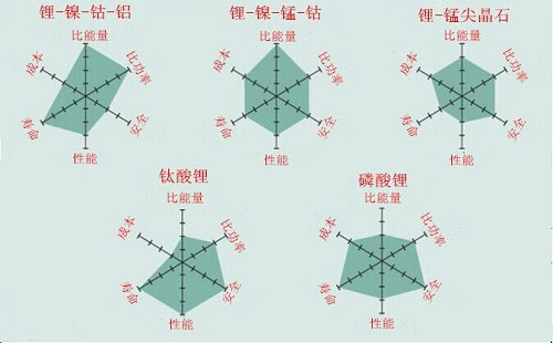 圖1比較了5種電池在安全性、比能量(也稱為容量)、比功率(電池的大倍率充放電的能力)、電池的高低溫性能、壽命(包括使用壽命和儲存壽命)以及成本6個指標的性能。但圖中沒有提及充電時間,如果有合適的電源插座可用,電動汽車動力系統的所有電池都可以快速充電,超快速充電是個例外情況,不過大多數用戶還是能夠接受幾個小時的充電時間的。圖1也沒有列出自放電性能——這是另一個需要重視的電池特性,在一般情況下,鋰電池自放電速率較低,如果電池是新的,自放電幾乎可以忽略不計。然而,因受熱引起的電池的老化會加速電池的自放電并引起電池管理上的問題。在電動汽車可選的電池類型中,磷酸鋰電池比其他電池系統自放電速率都高。