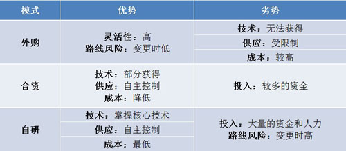 外購模式靈活度較高,不受電池路線變更帶來的風險,但是也因此無法獲得電池技術,并且電池供應受廠家限制,價格也相對較高。合資則可以獲得部分電池技術,電池供應也可以自主控制,同時可以降低成本(特斯拉通過合資建廠降低電池成本30%),但是合資時需要投入較多的資金。自研可以掌握核心的電池技術以及電池供應,并能極大地降低成本,但是需要投入大量的資金和人力成本,并將承受電池路線變更帶來的風險。