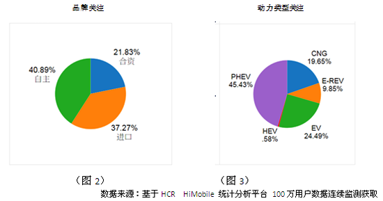 在傳統汽車市場領域,自主品牌失勢的格局在短時間內難以實現扭轉,但今年新能源汽車政策密集出臺,從HCR(慧辰資訊)HiMobile的監測數據來看,5月下旬用戶對自主品牌新能源汽車的關注度達到40.89%,彎道超車正待觀察。同時,純電動汽車(EV)市場領域絕大多數為自主品牌,如北汽E150EV、比亞迪E6、騰勢、江淮和悅iEV以及榮威E50等,但從HiMobile的監測數據來看,用戶仍然傾向選擇插電式混合動力汽車(PHEV),而且本次上海車展上推出多達數十款插電式混合動力車型,短期內插電式混合動力搶占新能源汽車市場已成為必然。