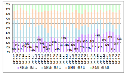 一、5月份從韓國進口多晶硅量達到4027噸,占當月總進口量的36.3%。1-5月份累計自韓國進口多晶硅19199噸,占累計總進口量的39.1%。韓國的主要出口企業OCI和韓國硅業(HankookSilicon)的稅率僅為2.4%和2.8%,反傾銷稅對其根本不造成任何影響,故韓國在2014年5月超過美國和德國,一躍成為最大的進口來源地,已經連續一年保持首位。因此,自韓國進口日漸猖狂是導致進口量一再沖擊高點的主要原因。《中國-韓國自由貿易協定》于2015年6月1日在韓國首爾簽署,附件指出,若對韓國的制裁明顯存在主要企業稅率過低和反傾銷措施后傾銷加重的情況,在終裁執行滿一年之后,可以按反傾銷規則對韓國企業的稅率適用提起復審,同時執行加工貿易暫停政策,以保證反傾銷措施效果。因此,在符合法規的前提下重新審視對韓國反傾銷稅率勢在必行。